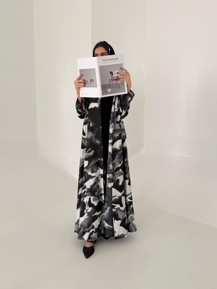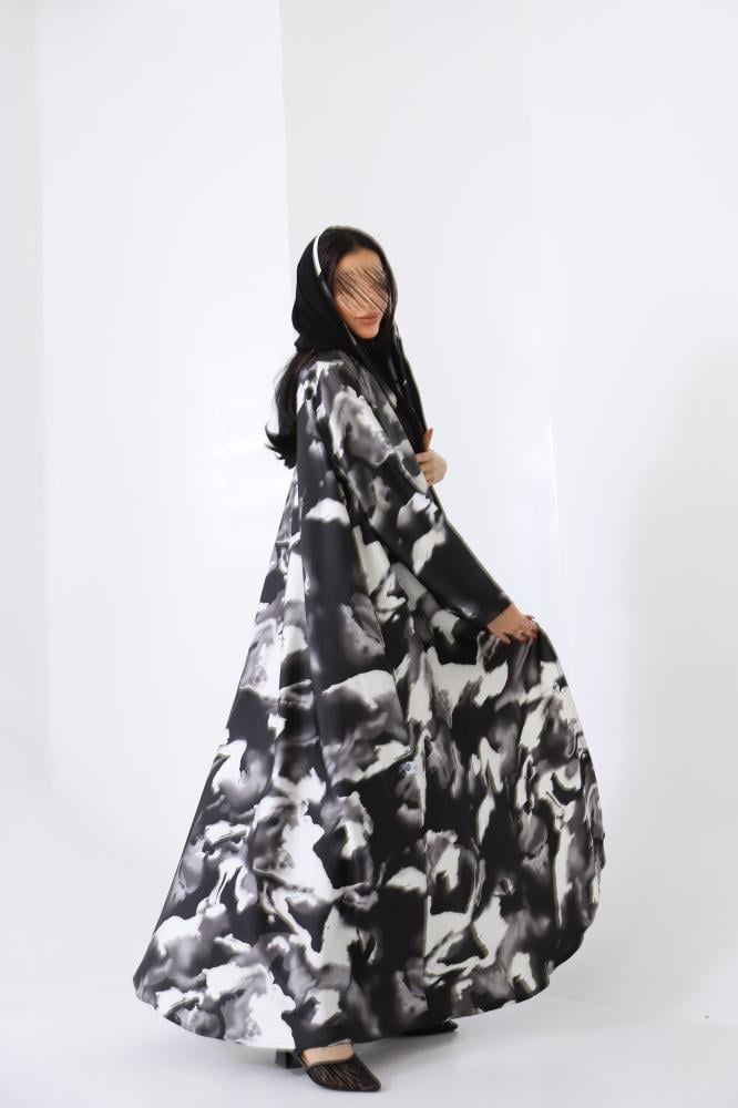 يندمج اللونين الأبيض والأسود في تصميم يجمع ما بين الطابع العصري والطابع الراقي وفي عباية من قماش الكريب الحرير المثالي لفصل الصيف. عباية خفيفة وأنيقة في الوقت ذاته تناسب جميع مناسباتك.