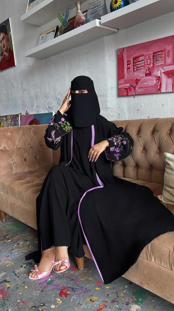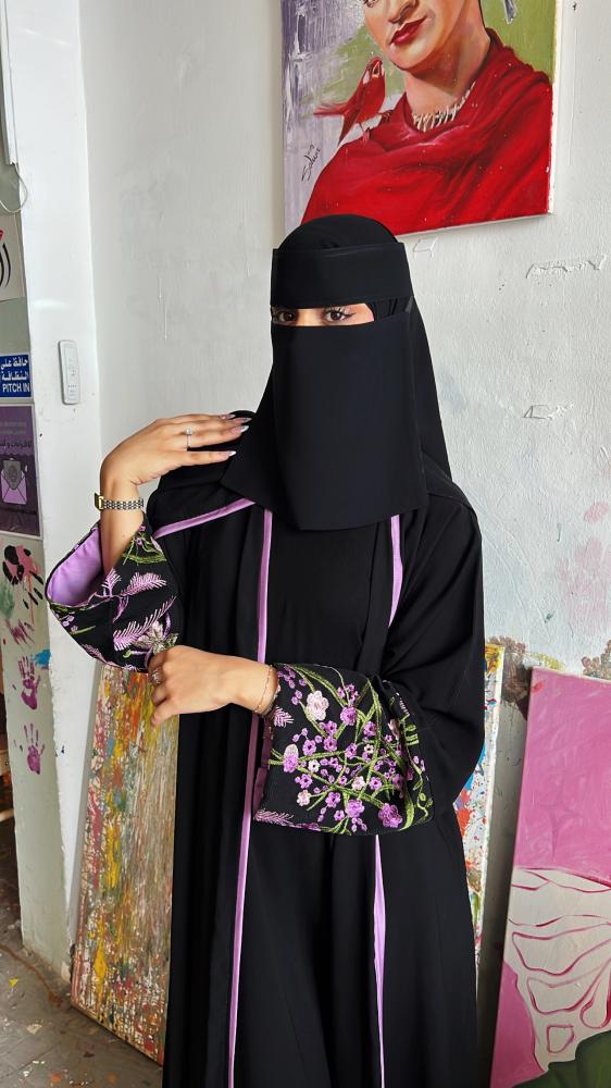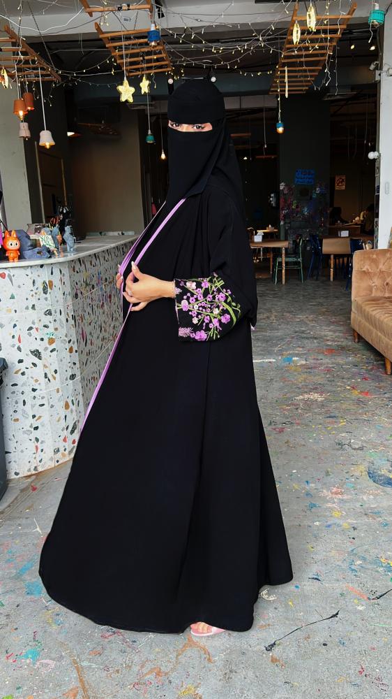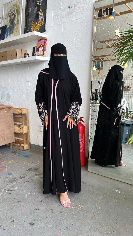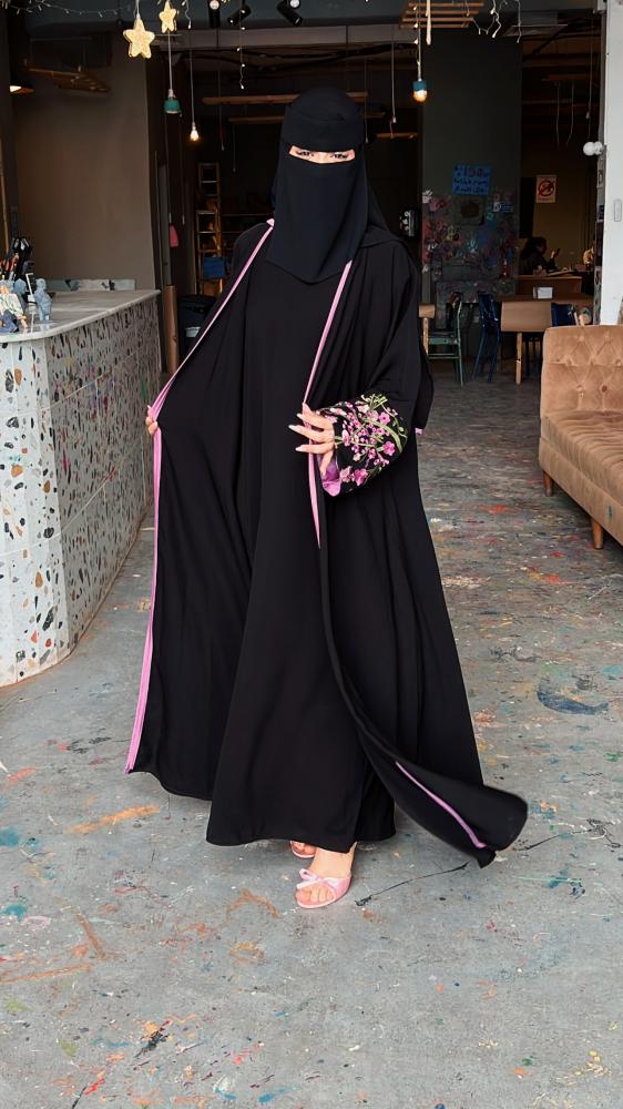 نوع القماش : كريب أسود مع أكمام مطرزه ومبطنه باللون الوردي